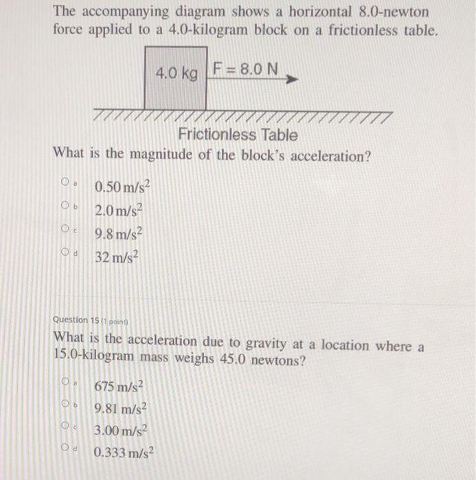 10 The diagram below shows a horizontal 80-new-ton force applied to a 40-kilogram block on a frictionless table. Meters per second to 30. We know that the acceleration due to gravity g of an object.